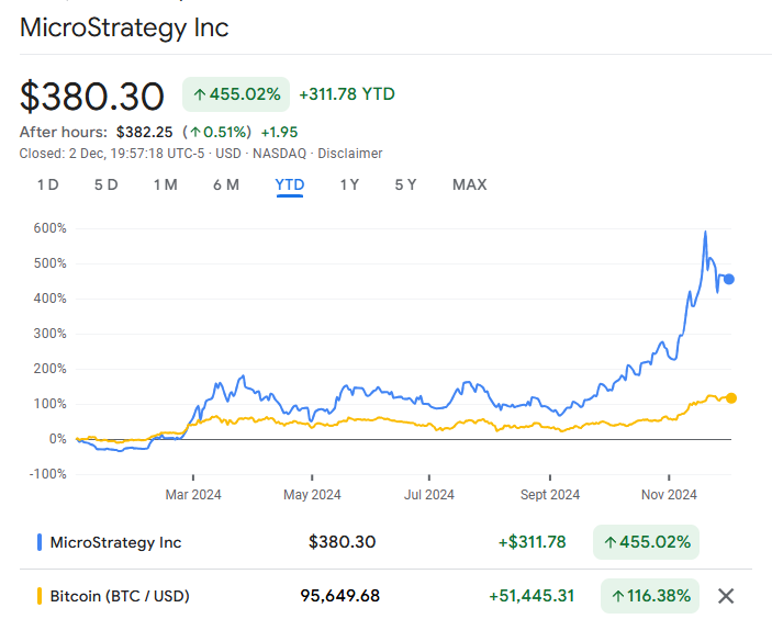 跟着特朗普当选,比特币一飞冲天,有好意思股“最大比特币代理”之称的MicroStrategy(MSTR)涨势愈加迅猛。自好意思国大选以来,比特币高涨近40%,MicroStrategy高涨67%;岁首以来,MicroStrategy涨幅高达455%,是比特币同期涨幅的快要4倍!