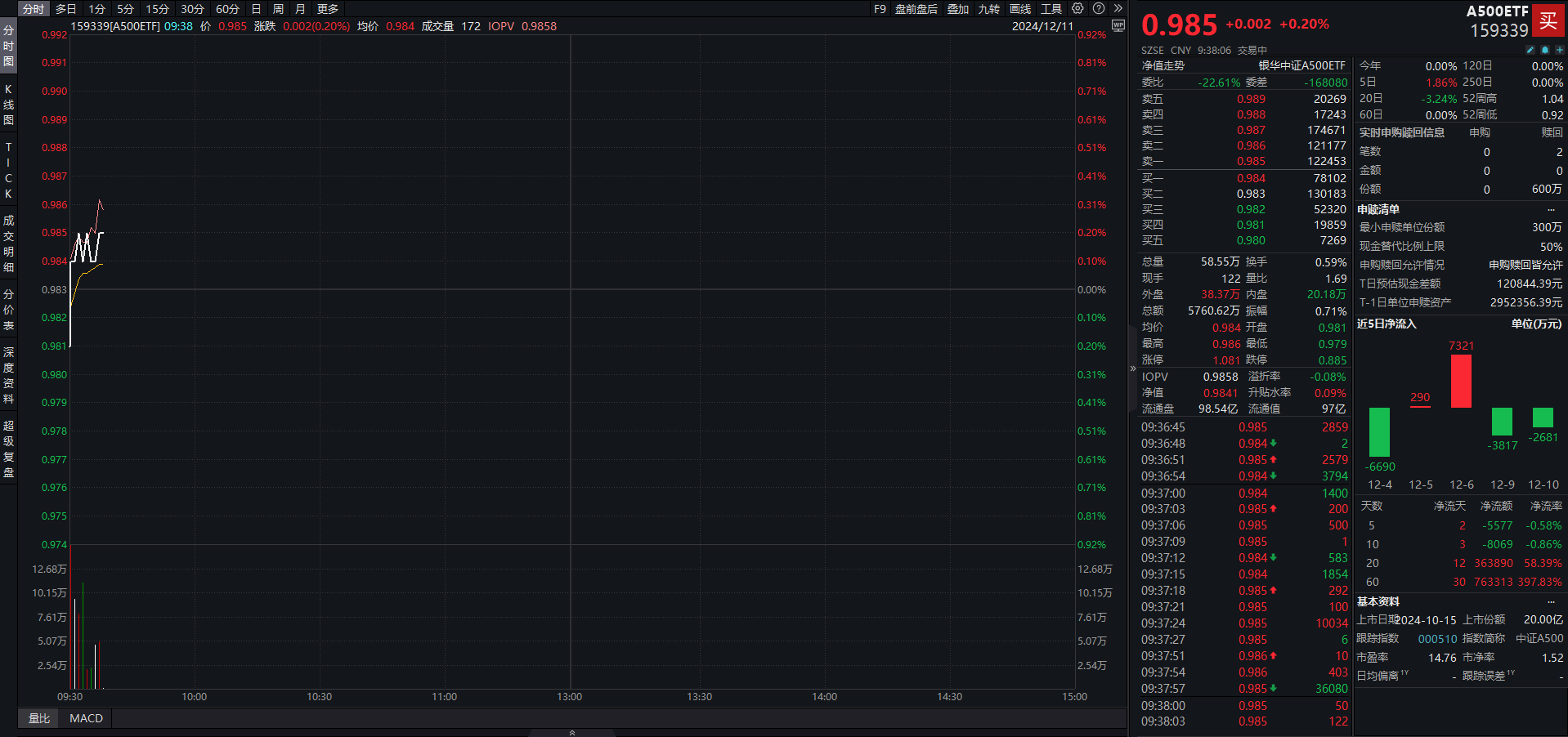 A500ETF(159339)细腻追踪中证A500指数,该指数优选各行业市值代表性强、表征行业龙头的500只股票,兼顾大市值的同期平衡狡饰A股各行业中枢龙头财富。同期,该指数编制和洽互联互通、ESG等筛选条目,便利境表里中遥远资金配置A股财富。