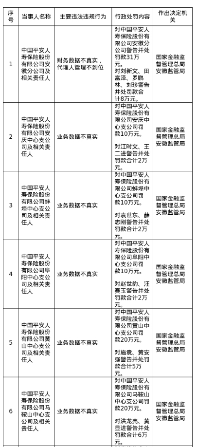 对此,国度金融监督惩办总局安徽监管分局对其警告并处罚金31万元;对刘新文、田富泽、罗鹏林、刘珍警告并处罚金所有8万元。